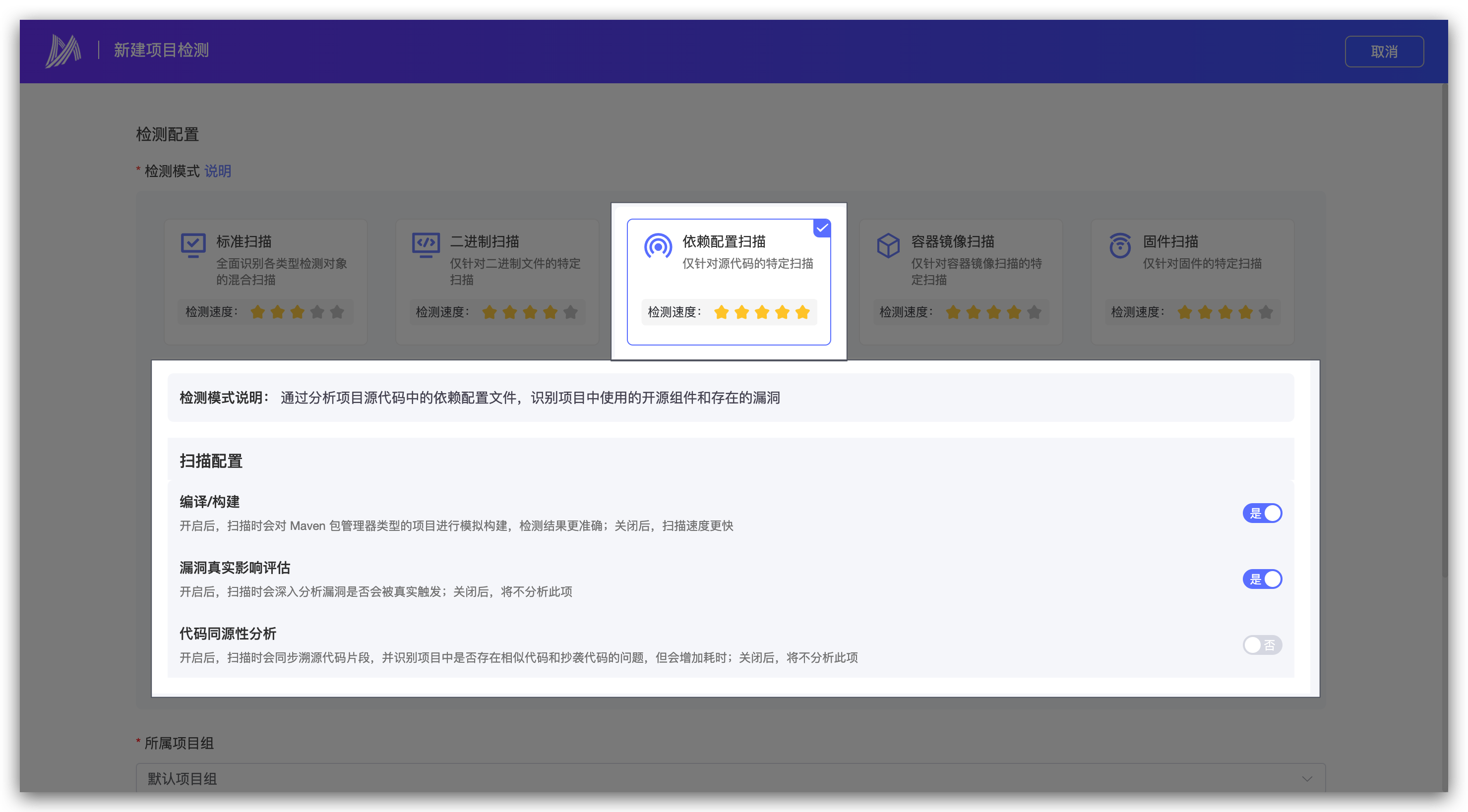 答:如果对检测速度没有特别要求,一般建议直接使用 标准扫描;如果只对源代码扫描,比如 Java、Go、Python 这些使用包管理的项目,使用 依赖配置扫描 模式速度较快(注意⚠️:如果是 C/C++,可能没有使用包管理器,那么应该使用 标准扫描);如果只对二进制,比如 Jar 包、可执行文件等,可以使用 二进制扫描