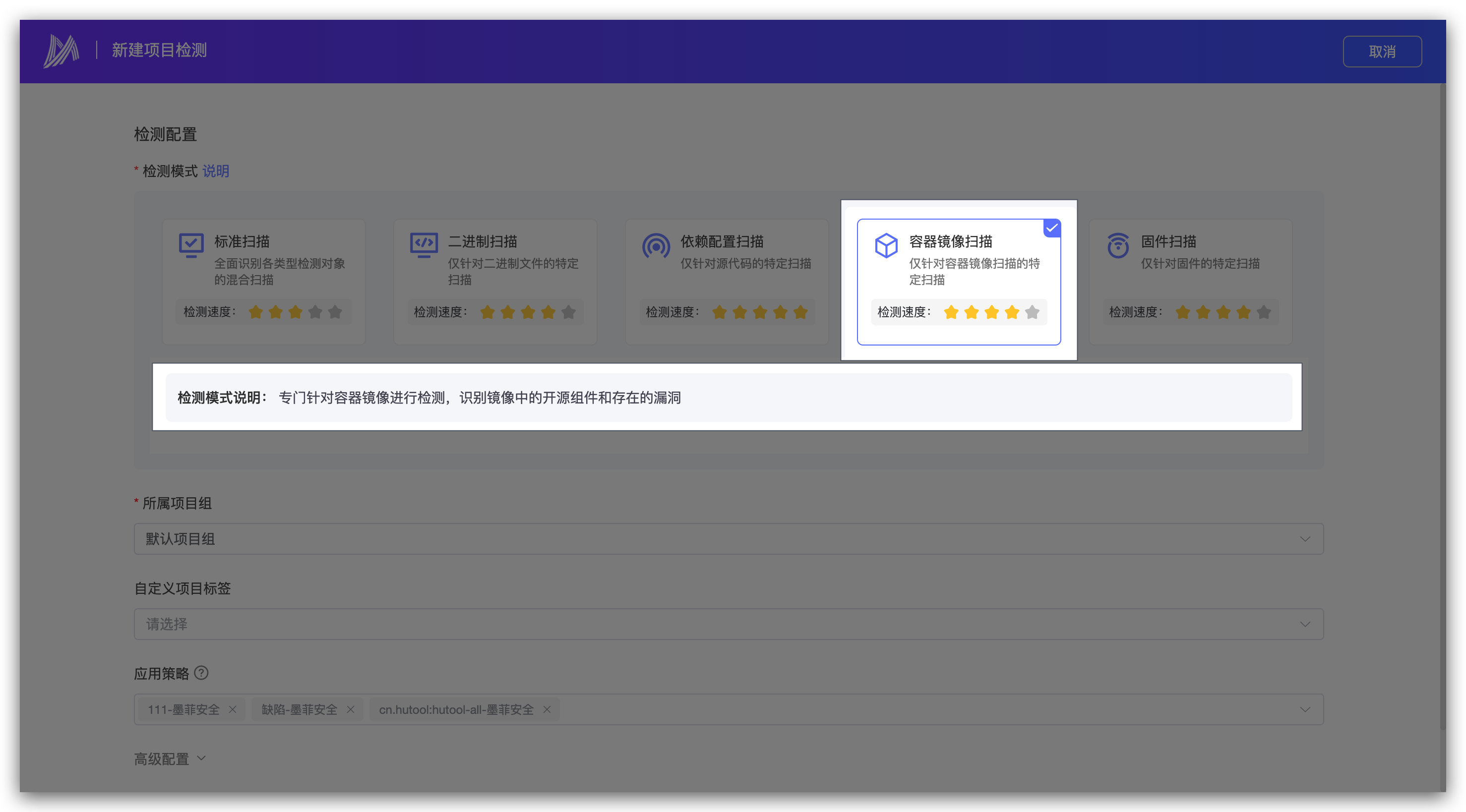 - 检测模式说明:标准扫描从项目中全方位扫描源代码、二进制、容器镜像、固件的混合扫描模式。选择后,将尽可能对文件中各种类型的文件进行扫描,来获取最全面的开源组件信息和存在的漏洞,扫描速度略慢。