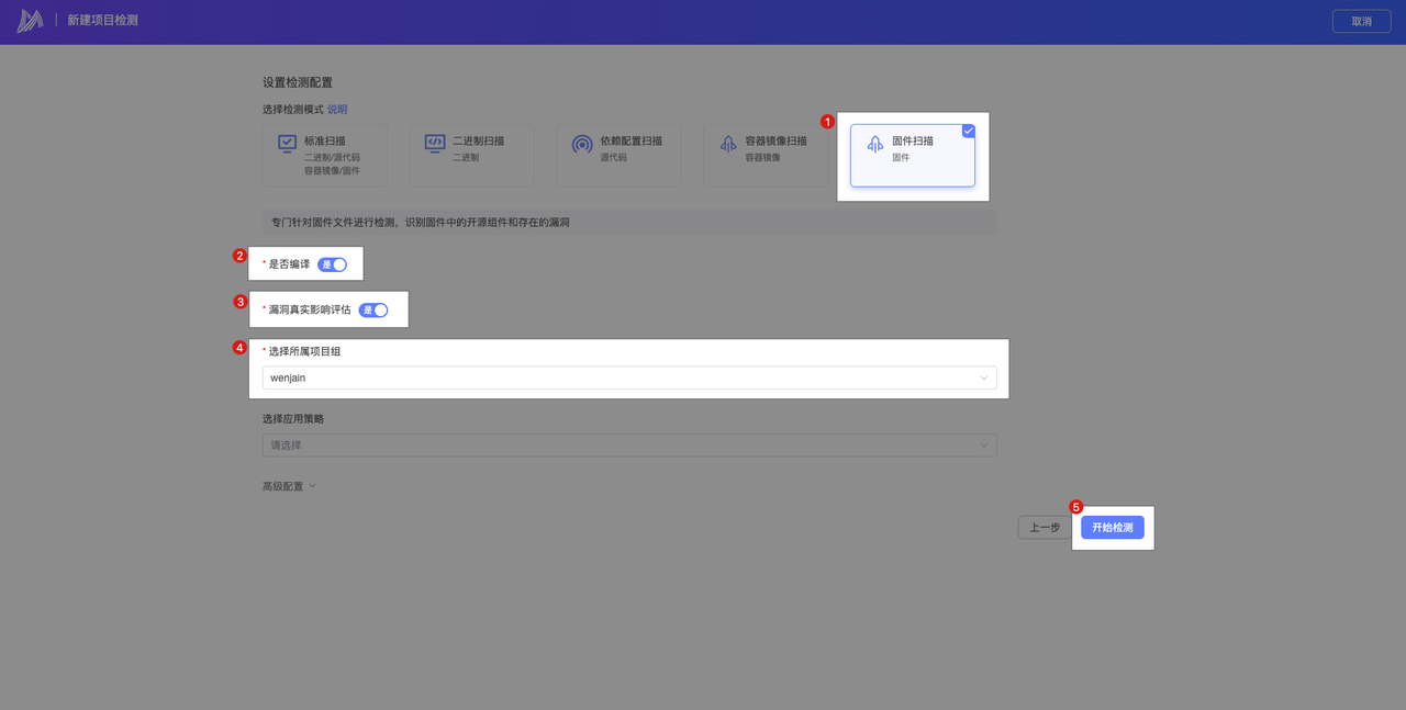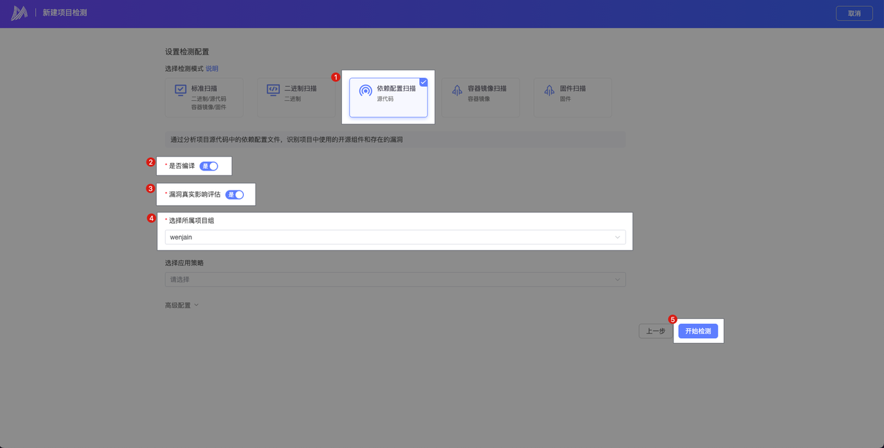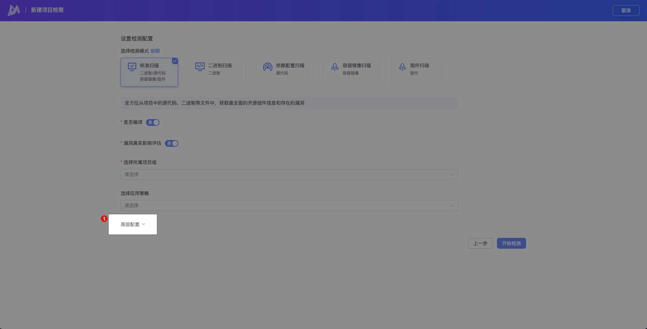 - 点击 标准扫描 -> 是否编译 -> 漏洞真实影响评估 -> 选择所属项目组 -> 开始检测 检测模式有 5 种:标准扫描 、二进制扫描 、依赖配置扫描 、容器镜像扫描 、固件扫描 方式一:标准扫描 介绍:全方位从项目中的源代码、二进制等文件中,获取最全面的开源组件信息和存在的漏洞