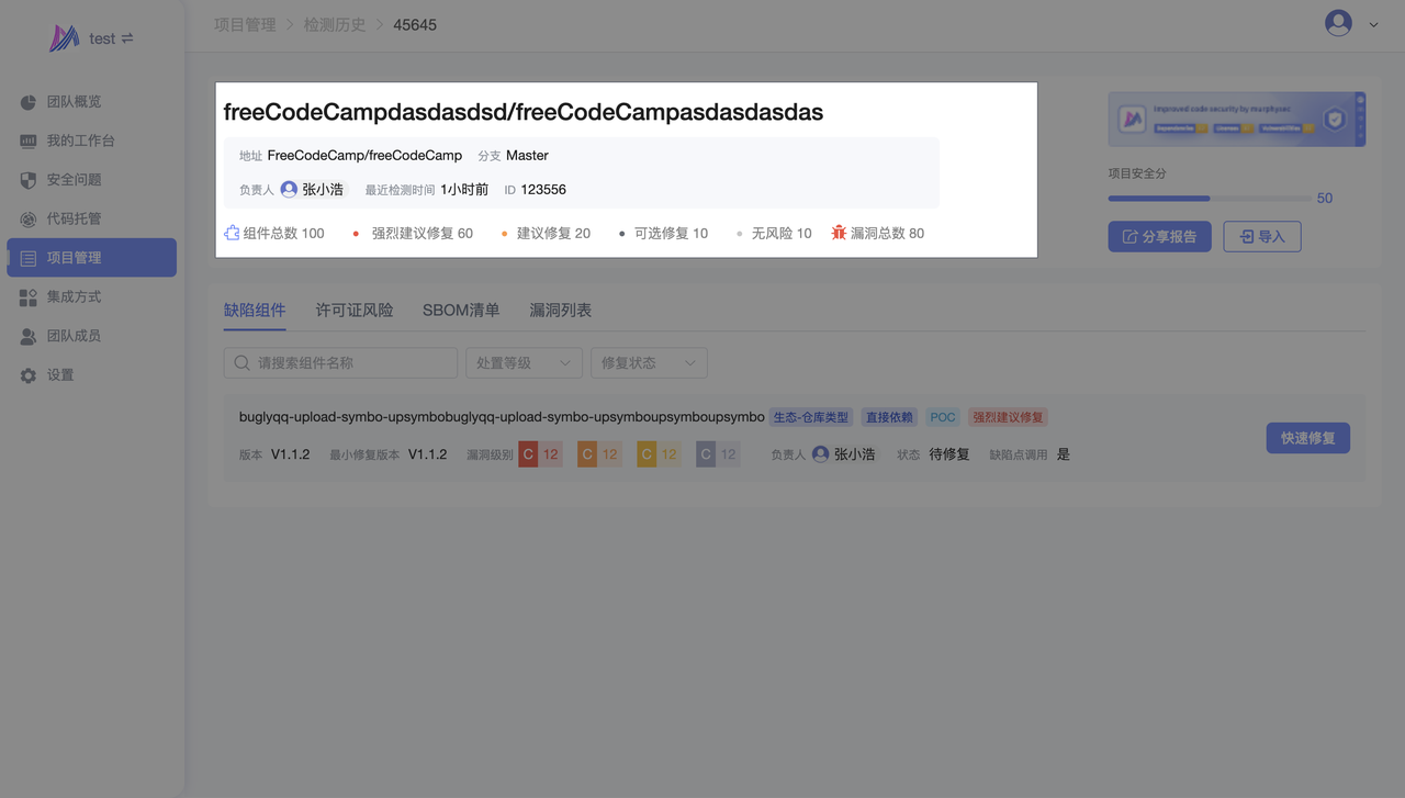检测完成后会生成项目安全报告,可以查看缺陷组件、许可证风险、SBOM 清单、漏洞列表等信息,更全面的掌握项目安全质量。