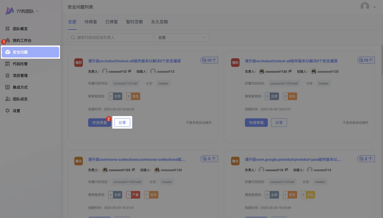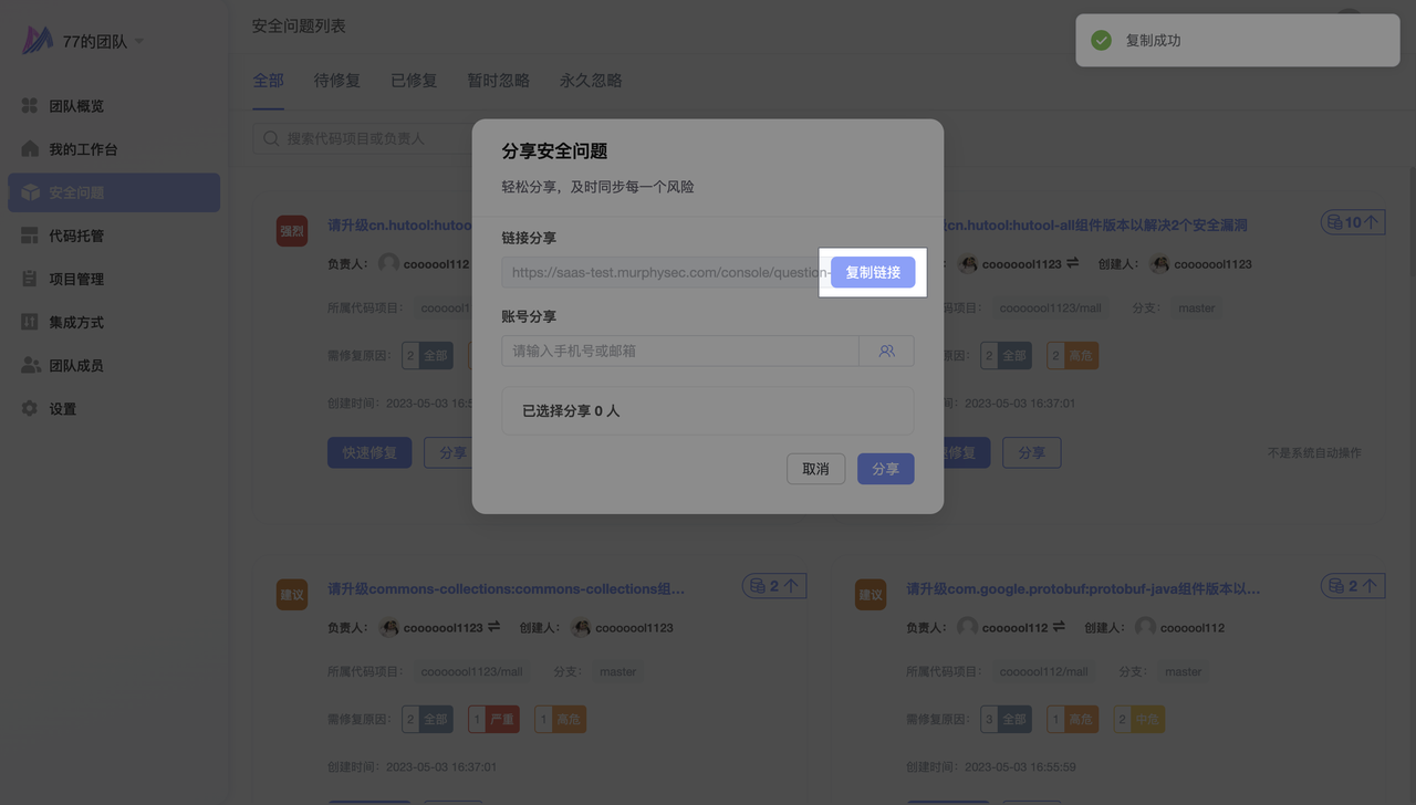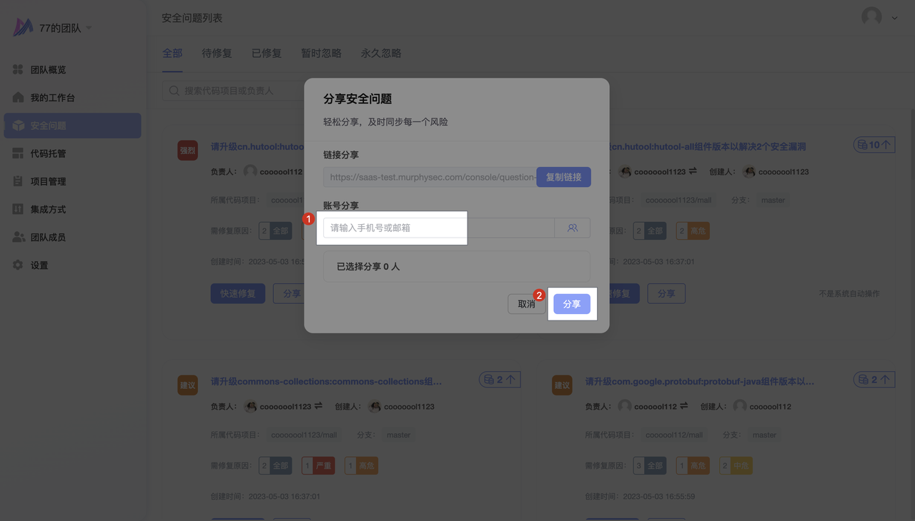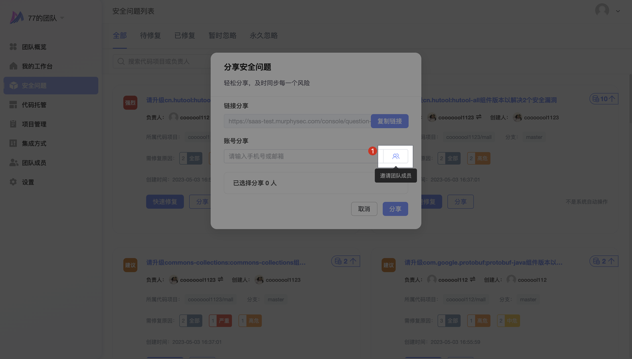 当您需要让其他小伙伴知晓某个安全问题时,可以将安全问题分享给团队内外部成员。