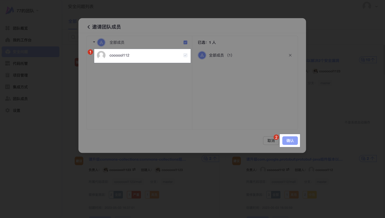 点击 邀请团队成员 进入团队成员选择界面,勾选团队成员,点击 确认 按钮将安全问题分享给团队内部成员