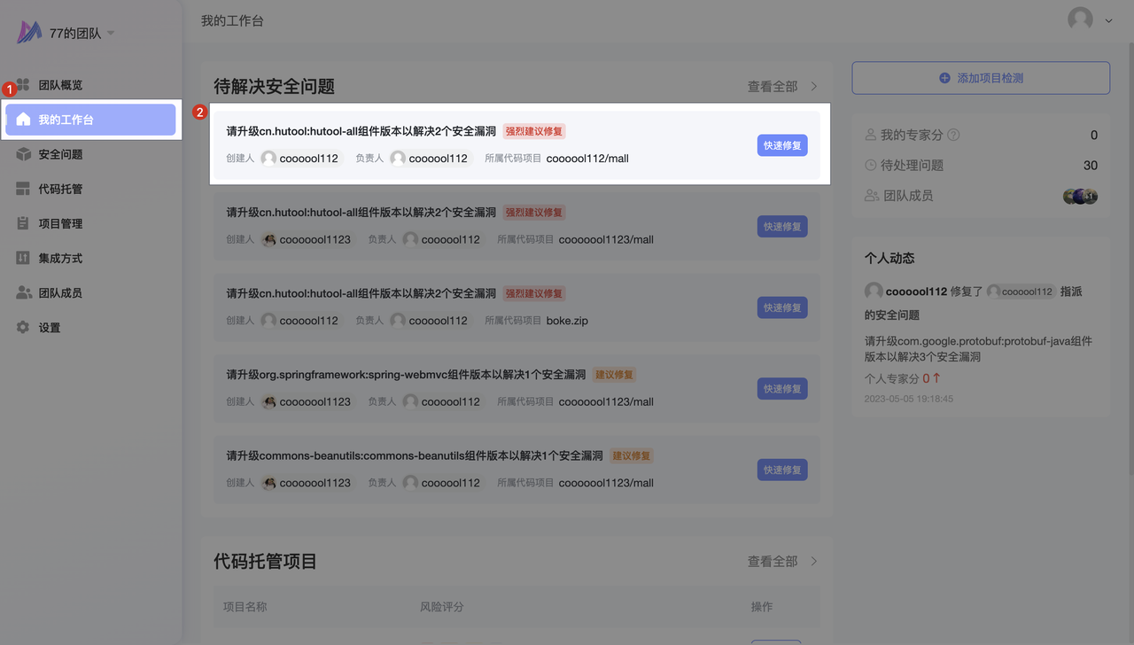 - 点击 链接 ,登录后进入 我的工作台 查看安全问题详情