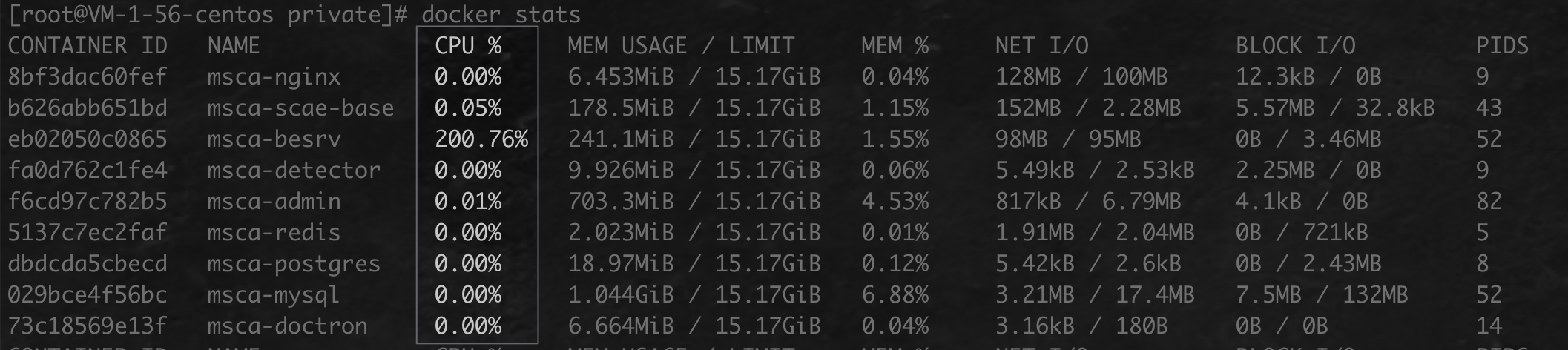 docker stats命令来查看所有容器的资源占用率,并将结果反馈给我们进行排查
