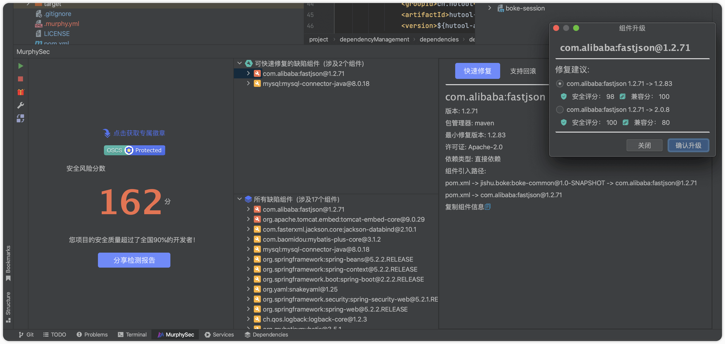 使用插件完成检测后,可通过“快速修复”功能,将缺陷组件直接升级至最优安全版本